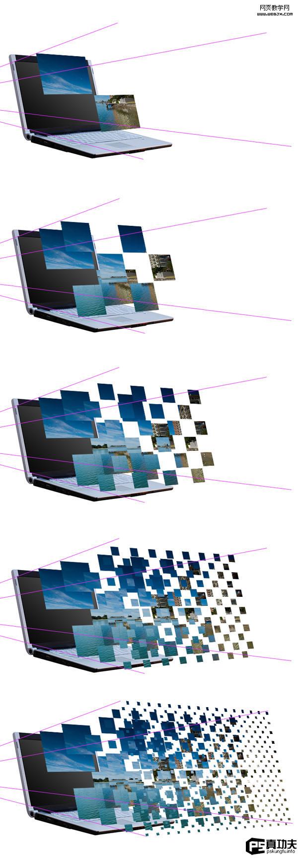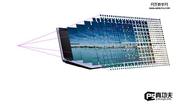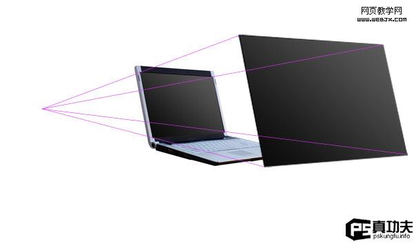 第三步現在,我們需要做一些透視輔助線(反思下自己有考慮這些技巧么),選擇直線工具,線條顏色選亮一點的,把大屏幕的每個角和原來筆記本的四個角連接起來,最后匯集到一點。如圖