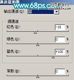 1、打開原圖素材,創(chuàng)建通道混合器調(diào)整圖層,對藍色進行調(diào)整,參數(shù)設(shè)置如圖1,效果如圖2。