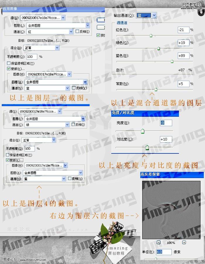 第5:這步里有包含通道混合器和應(yīng)用圖像/亮度對比度/高反差的運(yùn)用。