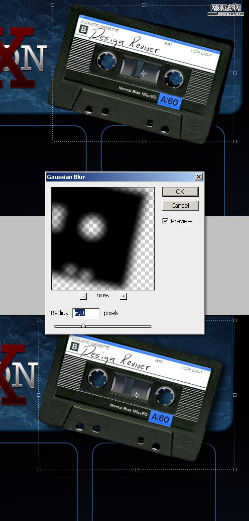 9.接下來對磁帶做陰影.這是一個做陰影的快速方法:按crtl+j復制對象,按crtl+u調出色相,設置亮度為-100,接著,濾鏡--模糊--高斯模糊,最后把圖層放在原對像后.如圖: