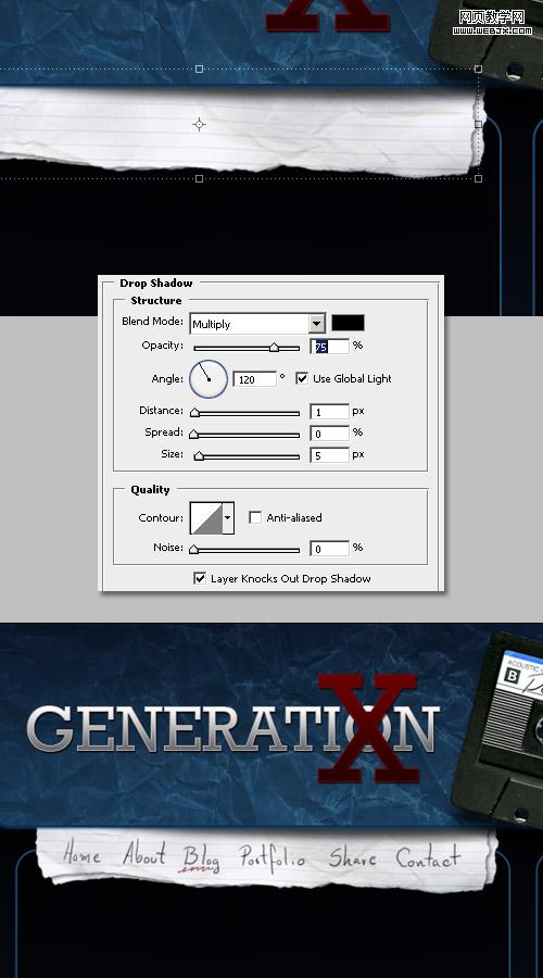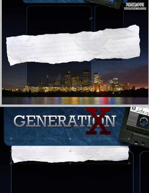 8.現(xiàn)在我們來給網(wǎng)頁添加些圖像.打磁帶文件,放在所有的圖層上面,然后添加一些文字.用鋼筆工具把磁帶中的透明部分摳出來,剪切并粘貼,利用變形工具對它進行變形,最后調節(jié)其的不透明度50%,60%,接差合并圖層,把磁帶圖層放在網(wǎng)頁的右側邊上.如圖: