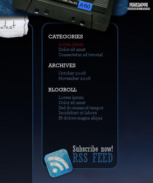 13.我們來給網(wǎng)頁添加個rss的圖標,在右邊加一些文字,可以用"rockwell condensed"字體.