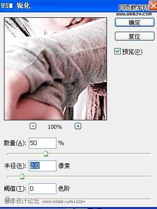 4、新建一層,蓋印圖層,執行濾鏡-銳化-usm銳化(銳化的目的是使皮膚更光滑、線條更清晰些),得到效果如圖: