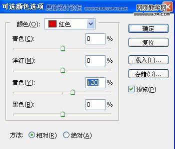 7、再對可選顏色的的紅色、黃色進行調整(目的是提高一下色彩之間的對比),參數如下,效果如圖: