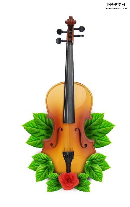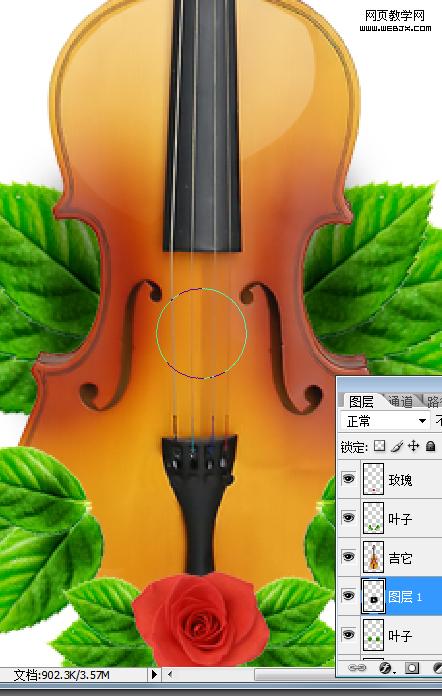 6、制作被吉它遮擋部位葉子的陰影。首先在葉子圖層上方新建圖層,選擇畫筆工具(硬度0),將圖層不透明度設為40%左右,用畫筆涂出陰影效果(注意只在吉它遮擋的部位涂陰影)