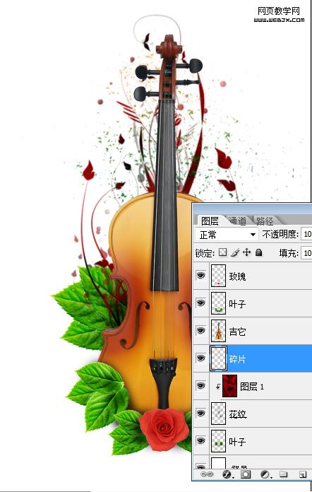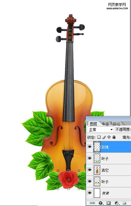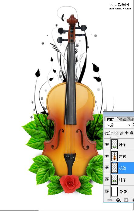 4、完成后將這兩個葉子圖層合并,放至吉它圖層下一層