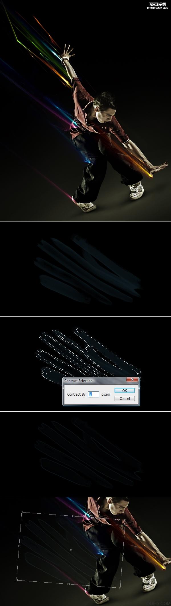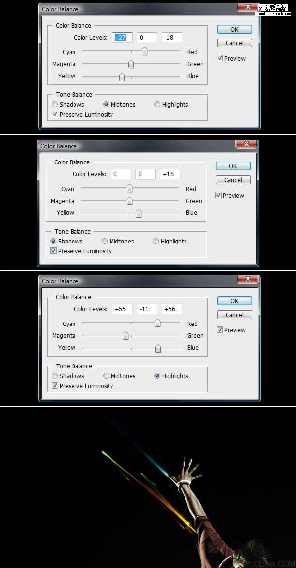 現在看起來這個人物真正的融合進了圖像中,這就是我們想要的。接下來,我開始展示制作光線技巧。 這是我為這一塊所準備的 abstract(這是光線的圖片)。因此打開這些光線并拖到項目中去,同時,改變其混合模式為線性減淡。這要放在所有層之上,除了之前兩個對顏色的調整圖層外。 現在看看這個過程。我已經有了這些抽象的燈光,我用加深工具(中間調)加深我不想要的部分(下面第二張圖片)。剩下許多這些短光線,因此我用硬邊的橡皮擦工具擦除我不想在這里看到的線(下面第三張圖片)。最后,我添加了圖像>調整>色彩平衡,精確調整這三條主線的色彩(藍色,綠色和黃色)。使這些線與眾不同而且明亮。 還要把每一條線分離,但在此之前,它們需要被裁剪到新層上。