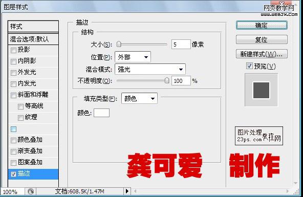 7.將人物拖動到我們剛才已經(jīng)做好背景的圖片中去。雙擊人物圖層,打開“圖層樣式”進行“描邊”設置,如圖。