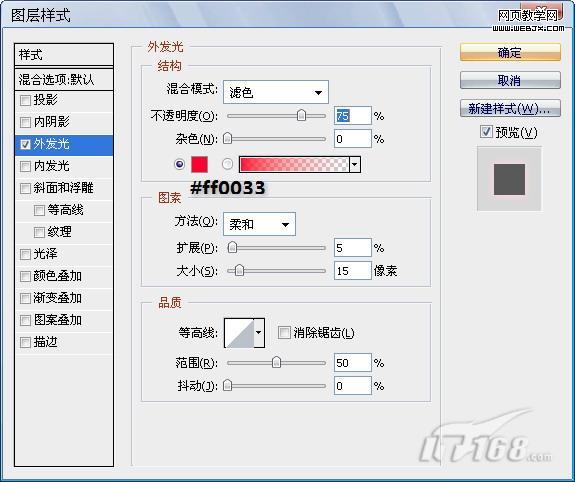 第九步:在圖層調(diào)板中雙擊【光斑】圖層的縮略圖,調(diào)出圖層樣式對話框,勾選【外發(fā)光】選項,其具體參數(shù)設置如圖10所示。