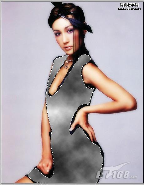 第四步:按【ctrl+enter】鍵,將路徑轉(zhuǎn)換為選區(qū)。點擊圖層調(diào)板下方的【創(chuàng)建新圖層】按鈕,新建一層,命名為【光】。確認前景色為黑色,背景色為白色,對【光】圖層執(zhí)行【濾鏡—渲染—云彩】命令,效果如圖04所示。