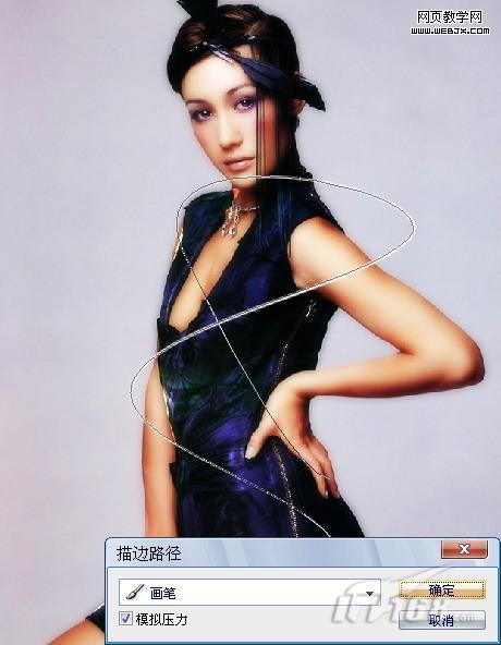 第七步:新建一層,命名為【光線】。將前景色設為白色。選擇【畫筆工具】,畫筆直徑為5像素,硬度為0%,進入路徑調(diào)板,在剛才繪制的路徑的縮略圖上點擊鼠標右鍵,在彈出的快捷菜單中選擇【描邊路徑】命令,在彈出的【描邊路徑】對話框中,勾選【模擬壓力】,然后點擊【確定】按鈕。描邊后效果如圖07所示。