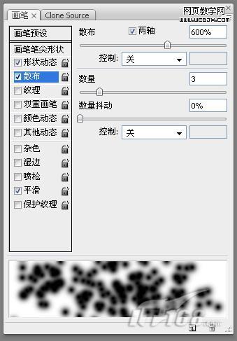 第八步:再次選擇【畫筆工具】,按【f5】鍵調(diào)出畫筆調(diào)板,勾選【散布】選項,其具體參數(shù)設置如圖08所示。