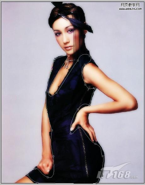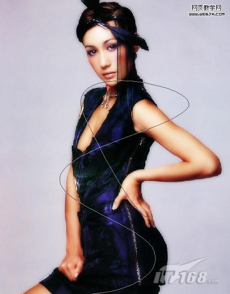 第三步:在工具箱中選擇【鋼筆工具】,使用路徑模式,繪制如圖03中所示的路徑,將人物的裙子部分選擇出來。選區(qū)不用很精確。