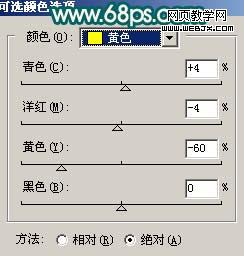 2、創建可選顏色調整圖層,對黃色進行調整,參數設置如圖3,效果如圖4。