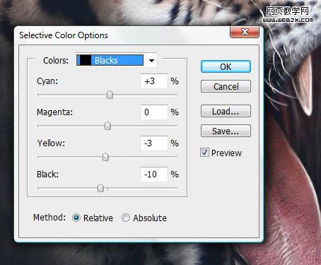 24、下面我們要添加調整蒙版,首先是可選顏色,選擇 圖層 > 新建調整圖層 > 可選顏色,分別選擇黑色和黃色,按下圖中的數據設置。