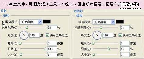 1、新建一個大小自定的文件,選擇圓角矩形工具,半徑設(shè)置為15像素,前景顏色設(shè)置為藍(lán)色,拉出一個圓角矩形,然后雙擊圖層調(diào)出圖層樣式,參數(shù)設(shè)置如下圖。 |