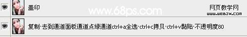 2、點通道面板,選擇濾色通道按ctrl + a 全選,按ctrl + c 復制,點藍色通道,按ctrl + v 粘貼。回到圖層面板,把圖層不透明度改為:80%。然后新建一個圖層,蓋印圖層,效果如圖4。