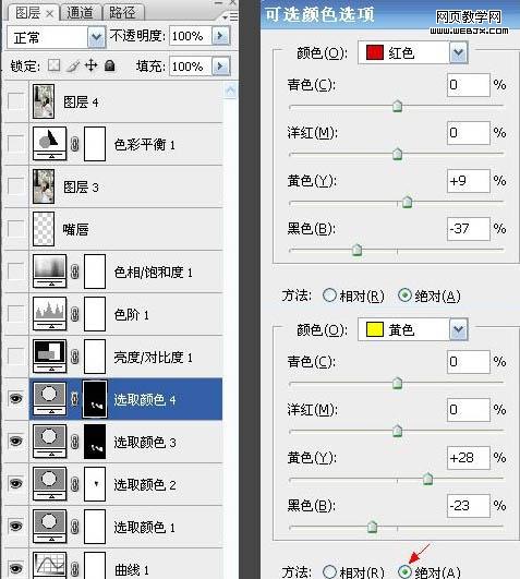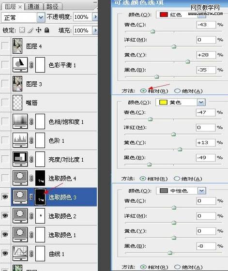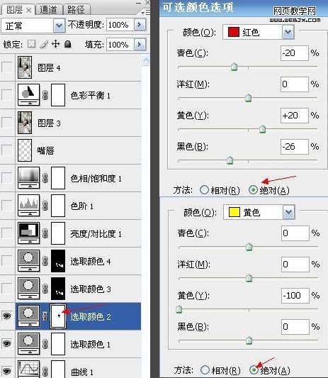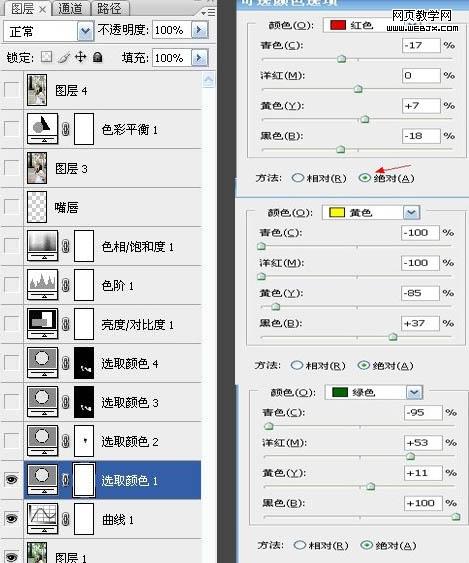 3、創(chuàng)建可選顏色調(diào)整圖層,對(duì)紅、黃、綠進(jìn)行調(diào)整,參數(shù)設(shè)置如下圖。其中紅色需要勾選“絕對(duì)”。