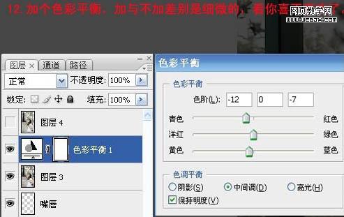 12、創(chuàng)建色相平衡調(diào)整圖層,參數(shù)及效果如下圖。