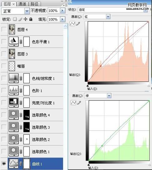 2、創(chuàng)建曲線調(diào)整圖層,對(duì)紅色和綠色進(jìn)行調(diào)整,參數(shù)及效果如下圖。