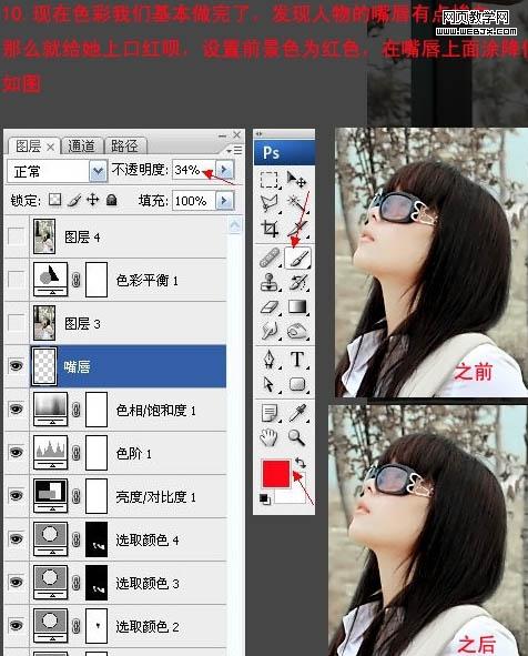 10、新建一個(gè)圖層,把前景顏色設(shè)置為紅色,然后用畫筆把人物的嘴部涂紅,適當(dāng)降低圖層不透明度,效果如下圖。