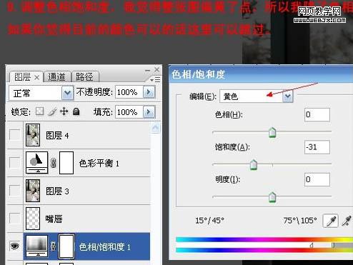 9、創(chuàng)建色相/飽和度調(diào)整圖層,對(duì)黃色進(jìn)行調(diào)整,適當(dāng)降低飽和度,參數(shù)及效果如下圖。