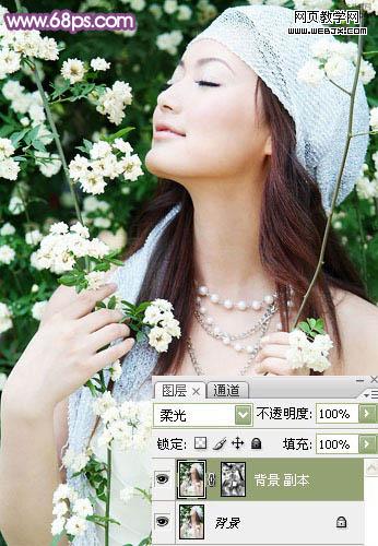 1、打開素材,ctrl+j復制一層養好p圖的習慣。模式選柔光,為圖層副本添加蒙板,用黑色畫筆,不透明度在32%左右,在圖片的亮部和暗部涂抹幾下,防止結塊(說明:柔光的效果是加強色調),效果如圖: