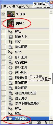 3、接下來這步很關(guān)鍵,打開“歷史記錄”面板,(窗口─歷史記錄)如圖所示:找到最下面的步驟“高斯模糊”,點(diǎn)擊鼠標(biāo)右鍵,執(zhí)行“新快照”命令,命好名,會在面板形成一個(gè)新的快照。