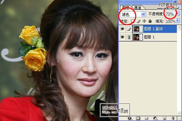 1、首先打開要修改的圖片,發(fā)現(xiàn)圖片整張較暗,先進(jìn)行整體亮度調(diào)節(jié),按“ctrl+J”鍵復(fù)制一層,修改圖層的修改模式為“濾色”,并調(diào)節(jié)它的不透明度為“70%”,整個(gè)換面立刻提亮起來。按“ctrl+E”合并兩個(gè)圖層。
