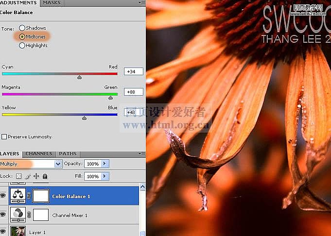 2、創建色彩平衡調整圖層,對中間調進行調整,參數設置如下圖。確定后把圖層混合模式改為“正片疊底”。
