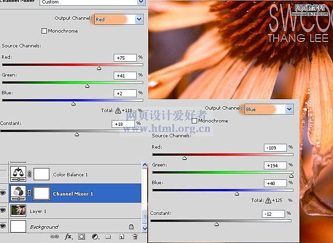 1、打開原圖素材,創建通道混合器調整圖層,對紅,藍進行調整,參數及效果如下圖。