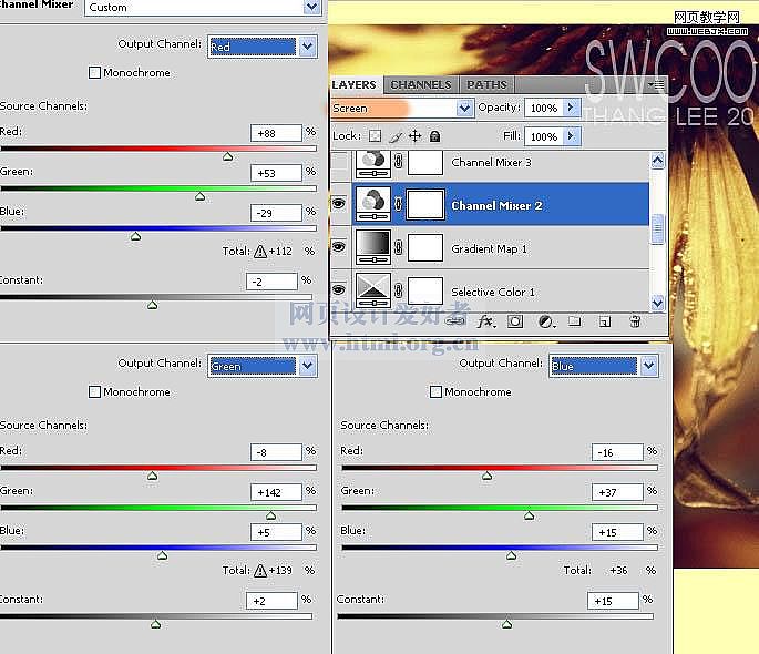 6、創建通道混合器調整圖層,對紅,綠,藍進行調整,參數設置如下圖。確定后把圖層混合模式改為“濾色”,效果如下圖。