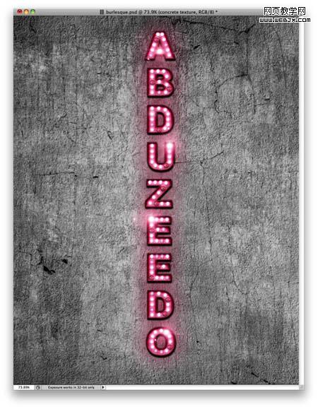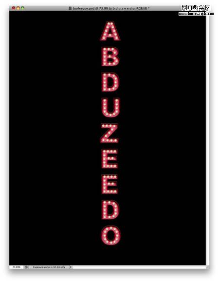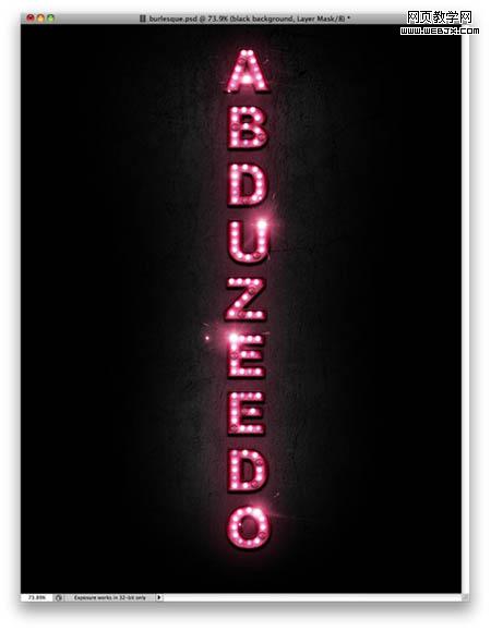 本教程介紹霓虹字的制作方法。大致過程:打上文字后用圖層樣式做出簡單的發光字效果,然后添加一些燈泡等素材裝飾在文字中間,再渲染一下顏色即可。