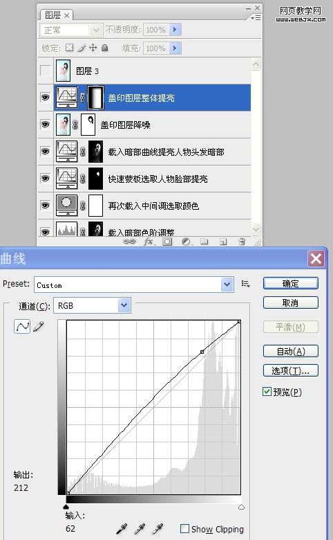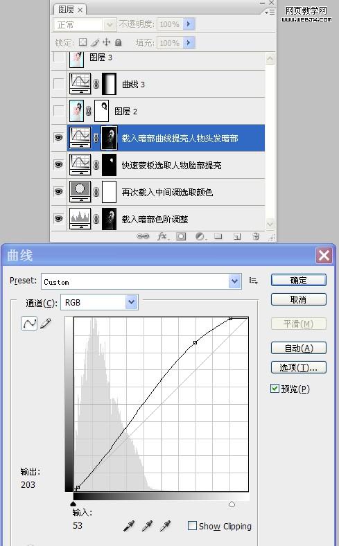 12、感覺人物頭發有些偏暗,再次進入通道面板,載入“暗部”選區,添加“曲線”調整圖層,按照設置參數對人物頭發進行提亮。如圖所示: