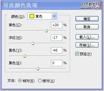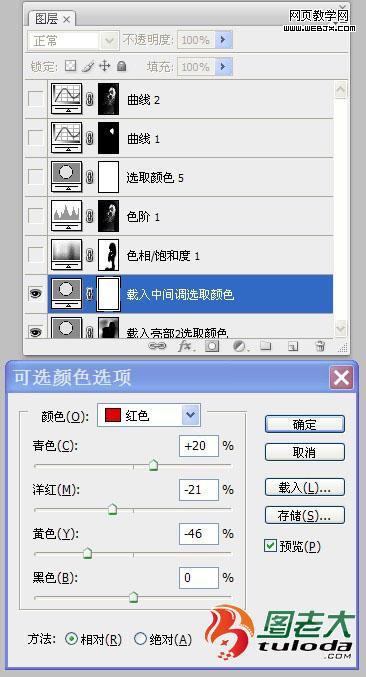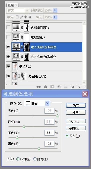 11、感覺人物膚色有些偏淡,再次進入通道面板,載入“中間調”選區,添加“可選顏色”調整圖層,按照設置參數對人物膚色再次進行調整。如圖所示: