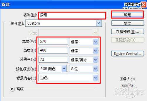 1、打開Adobe Photoshop,執行菜單:“文件”/“新建”(快捷鍵Ctrl+N),彈出新建對話框,設置名稱:按鈕,寬度:570像素,高度:400像素,分辨率:72像素/英寸,顏色模式:RGB顏色、8位,背景內容:白色,設置完畢后單擊確定按鈕,如圖1所示。