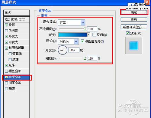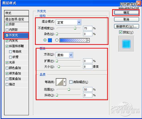 3、接著右擊圖層4,選擇混合選項,進入到圖層樣式,分別勾選投影、外發光、內發光、斜面與浮雕、光澤、漸變疊加選項,設置圖層樣式各項的值,參考下面的設置值,然后點擊確定按鈕,如圖4、5、6、7、8、9所示。效果圖如圖10所示。
