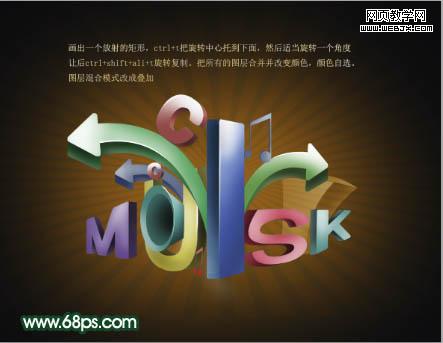 13、畫出一個放射的矩形,按Ctrl + T 把旋轉中心移到下面,然后適當旋轉一個角度,再按Ctrl + Alt + Shift + T 復制,把所有的復制圖層合并,再適當改變一下顏色,顏色自選,確定后把圖層混合模式改為“疊加”。