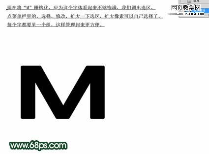 2、現在將“M”柵格化,這個字體看起來不夠飽滿,我們調出選區,選擇菜單:選擇 > 修改 > 擴大,把選擇擴大一些,數值自己把握。每個字都要建一個組,這樣管理起來更方便。