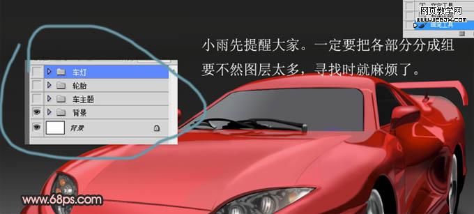 1、前期準(zhǔn)備:小雨先提醒大家,一定要把車子的各部分分成不同的組,要不然圖層太多,尋找修改的時候就非常方便。