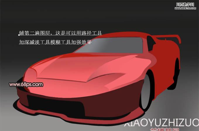 3、鋪第二遍圖層,這是可以用路徑,加深,減淡,模糊工具加強(qiáng)效果,如下圖。