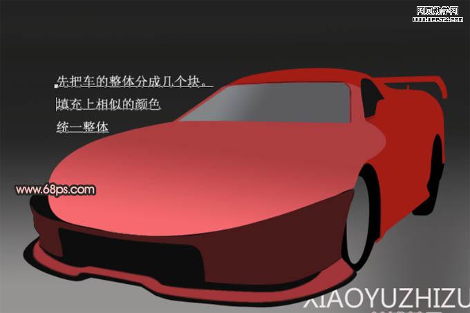 2、先把車的整體分成幾個塊,填充上相似的顏色,統(tǒng)一整體,如下圖。