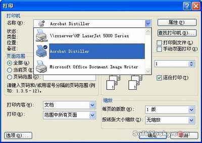 現在比較流行的DoctoPdf類軟件如Pdfprint等的機理都是調用Adobe Distiller打印機實現的,如果想把一個Doc文件轉換為Pdf文件,只要用Office Word打開該Doc文件,然后在“文件”—>“打印”中選擇Acrobat Distiller打印機即可,如圖2所示: