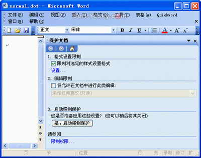 打開文檔或模板后,選擇菜單“工具→保護(hù)文檔”。在新出現(xiàn)的任務(wù)窗ge中,如圖二,選中“限制對(duì)選定的樣式設(shè)置格式”,然后點(diǎn)擊下面的“設(shè)置”鏈接,打開“格式設(shè)置限制”對(duì)話框,如圖三。