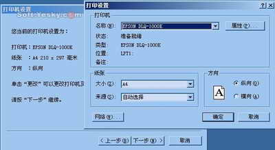 第二步、打印設置。在這里,程序顯示你當前打印機的型號、缺省紙張大小,方向等信息。如果信息有誤,你可以單擊“更改”按鈕進行修改。單擊“下一步”。(見圖4)