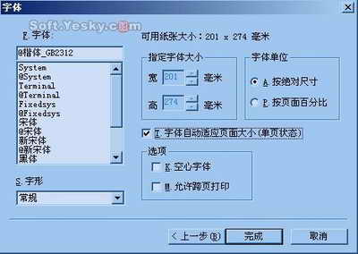 3、在“選項”中有“空心字體”和“允許跨頁打印”設置項。“空心字體”顧名思義就是指文字是空心的,某些場合用得上。“允許跨頁打印”通常要與上面的“指定字體大小”結合起來使用。如果指定的文字大小大于紙張大小,那么程序會自動將一個字拆成幾個部份分別打印,然后你再手工組合起來,這樣做可以打印出更大的文字。單擊“完成”進入到主界面。