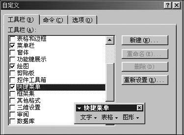 ①右擊工具欄,選擇“自定義…”命令,彈出“自定義”對話框,單擊“工具欄”選項卡,選中“工具欄”列表中的“快捷菜單”復選框,此時在屏幕上彈出“快捷菜單”工具欄,如圖2。