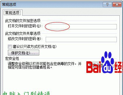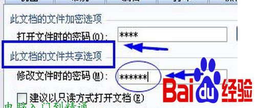 設置【修改文件時的密碼】。 設置后只能查看文檔,不能修給文檔內容。若要修改必須輸入修改密碼。按照上面的方法依次打開到【安全性】窗口,然后在【此文檔的文件共享選項】里輸入密碼。