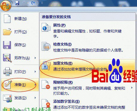 word2007文檔加密方法一打開文檔,單擊Office按鈕,選擇【準備】,在彈出菜單中選擇“加密文檔”;