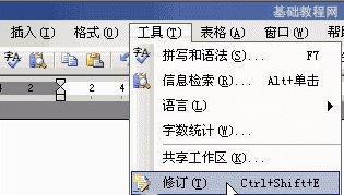 1)選中文字“修改”,點菜單“工具-修訂”,下面狀態欄上的“修訂”從灰色變成黑色可用狀態;